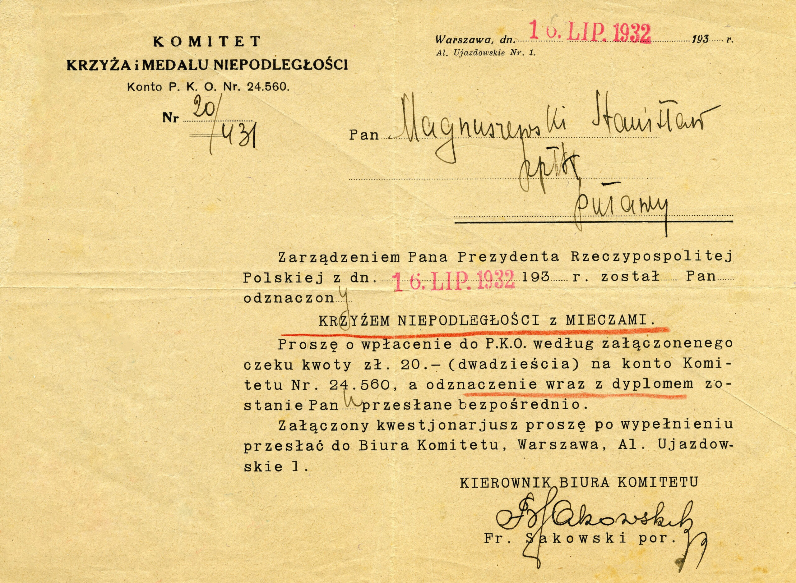 Zawiadomienie o nadaniu Krzyża Niepodległości z Mieczami dla ppłk. w st. sp. Stanisława Magnuszewskiego, 16 lipca 1932 r., z archiwum Stanisława Konopki