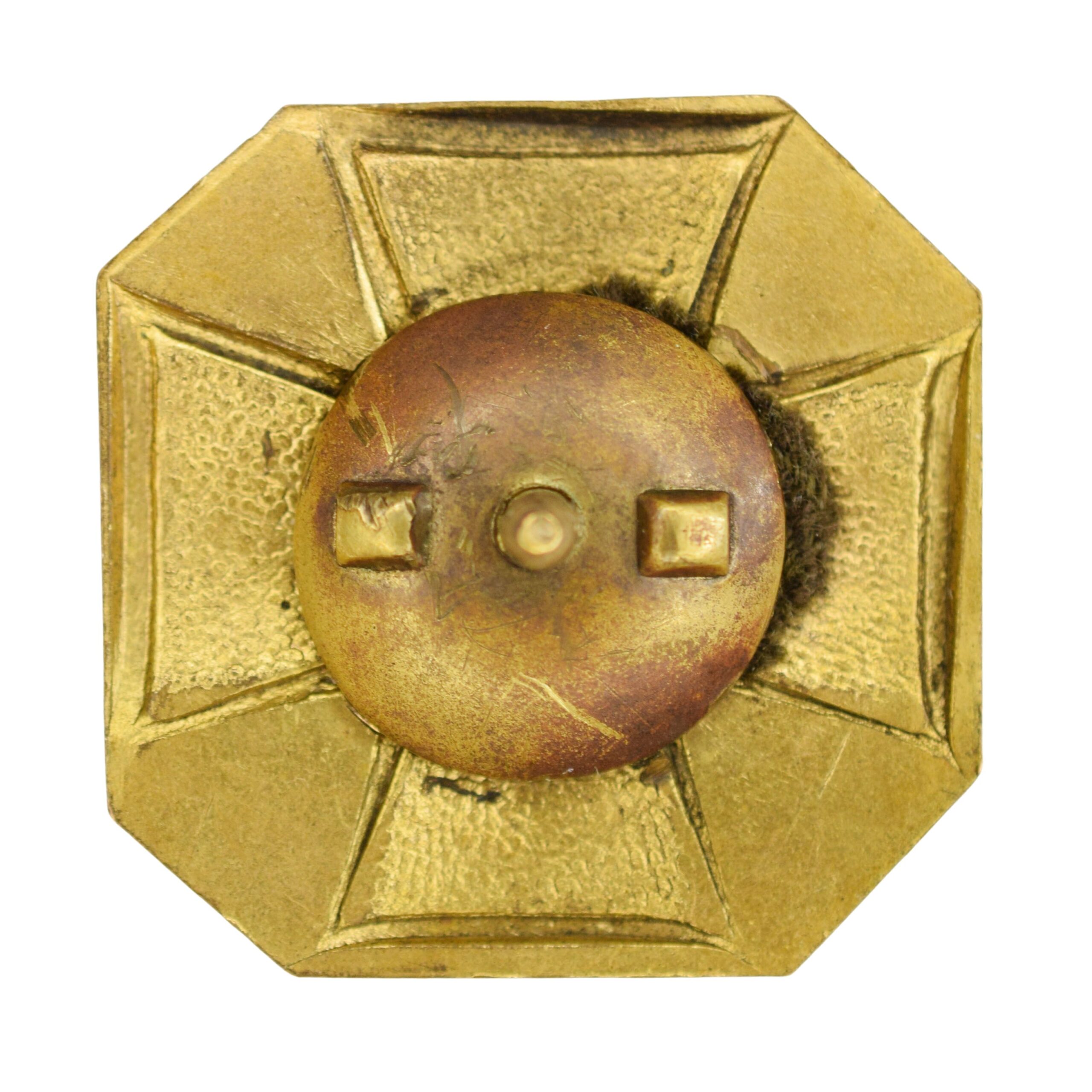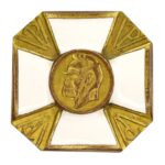 II RP: Odznaka Komendancka Przysposobienia Wojskowego, tombak złocony, biała emalia, nakrętka poruszająca się po gwincie, lecz nie można jej zdjąć z odznaki.
