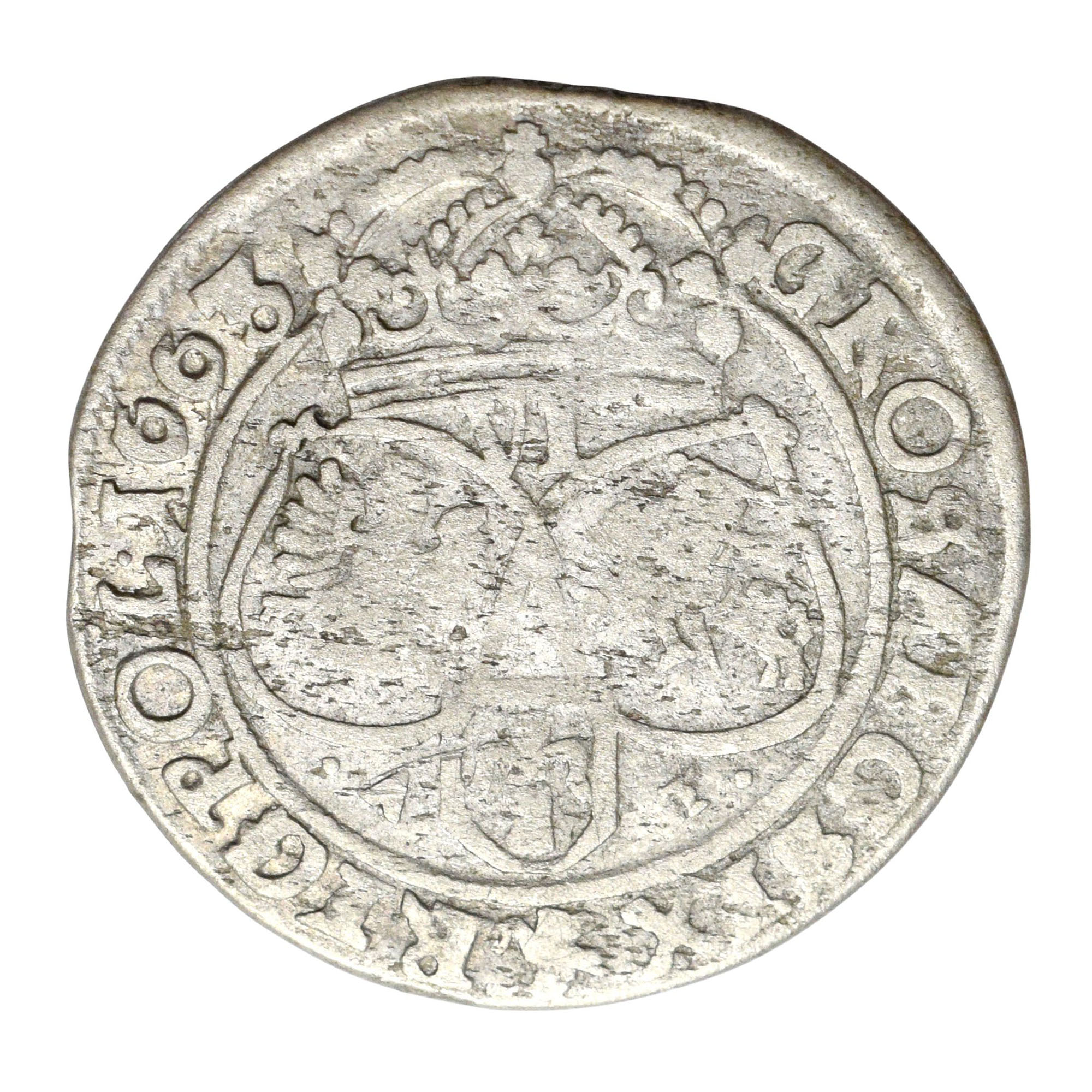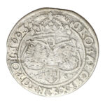 Rw.: Pod koroną herb Orzeł, Pogoń i Snop Wazów, w otoku: GROS ARG SEX [herb Ślepowron] REG POL 1663