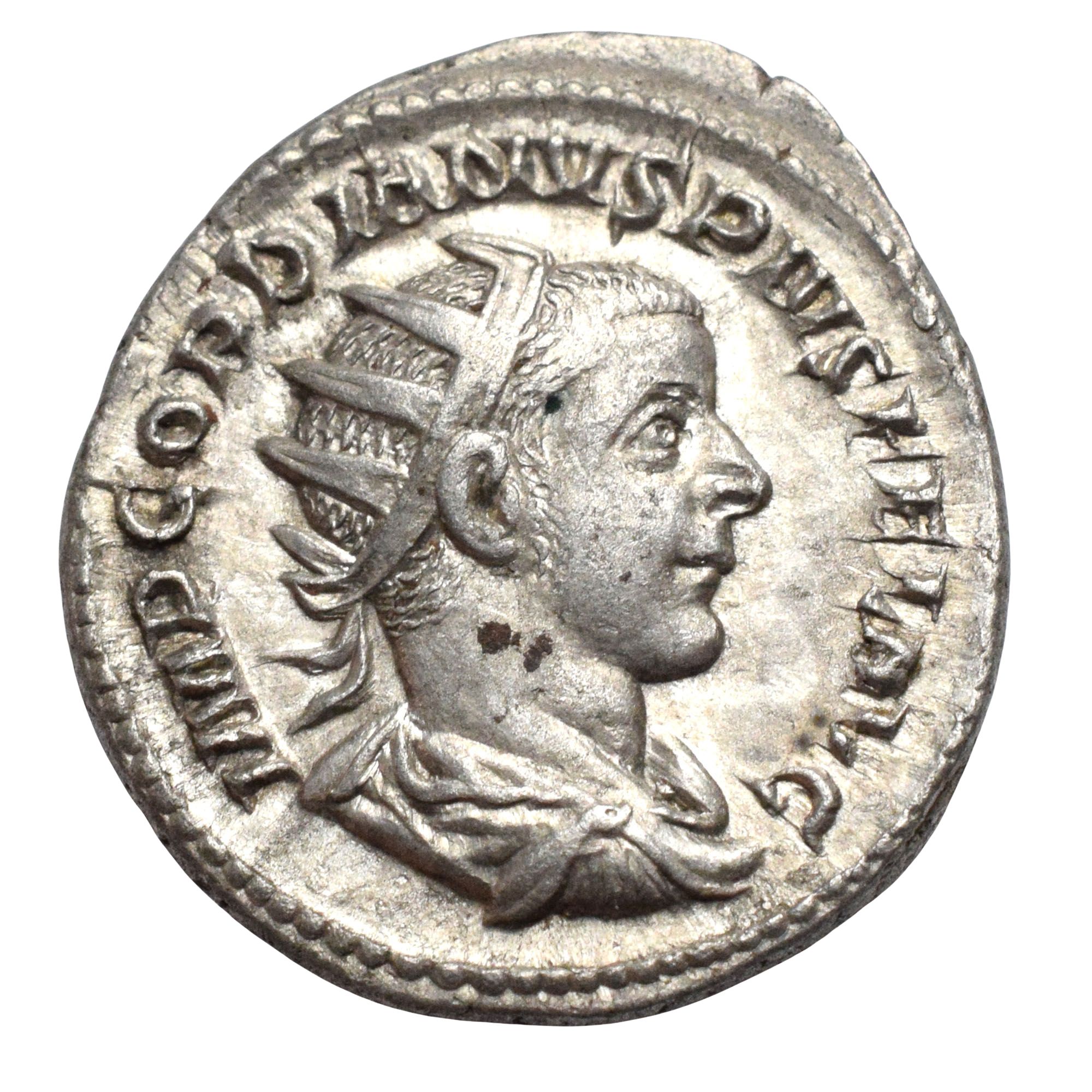 Aw.: popiersie cesarza w koronie radialnej, w otoku: IMP GORDIANVS PIVS FEL AVG