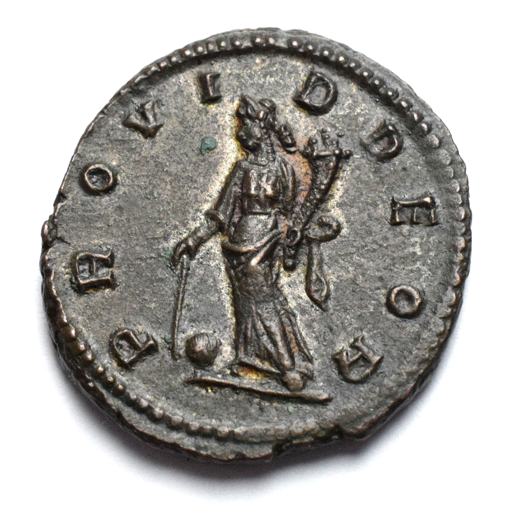 Rw.: stojąca Providentia trzymająca różdżkę i róg obfitości, mająca u stóp glob, w otoku: PROVID DEOR