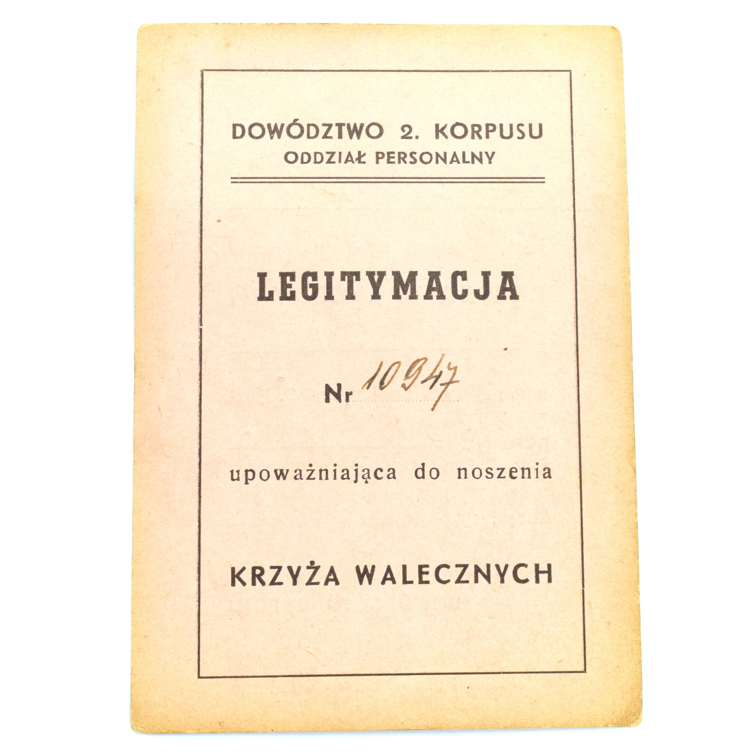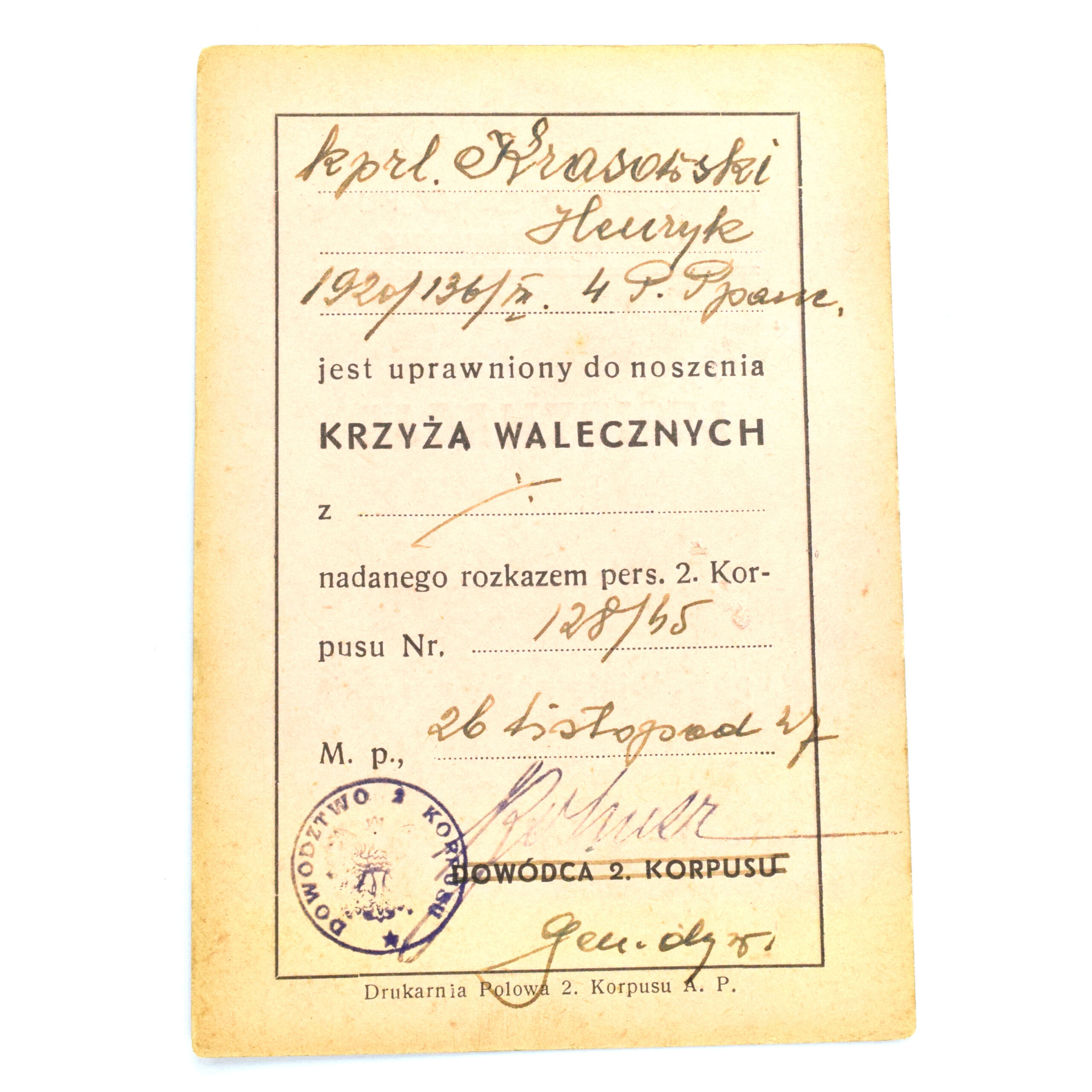 Krzyż Walecznych (nr 23 wg książki Krogulca) wraz z nadanie odznaczenia dla kaprala Henryka Krasowskiego z 4 Pułku Przeciwpancernego z 2 Korpusu Polskiego.