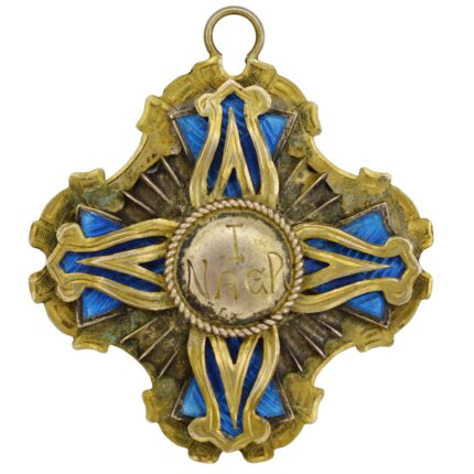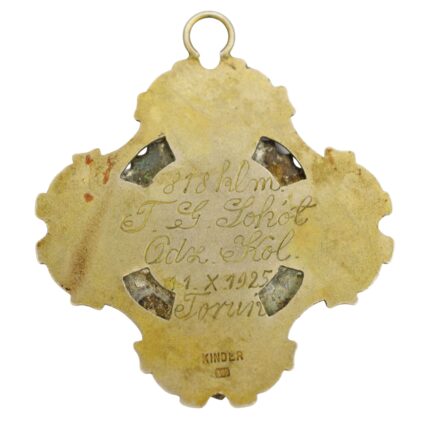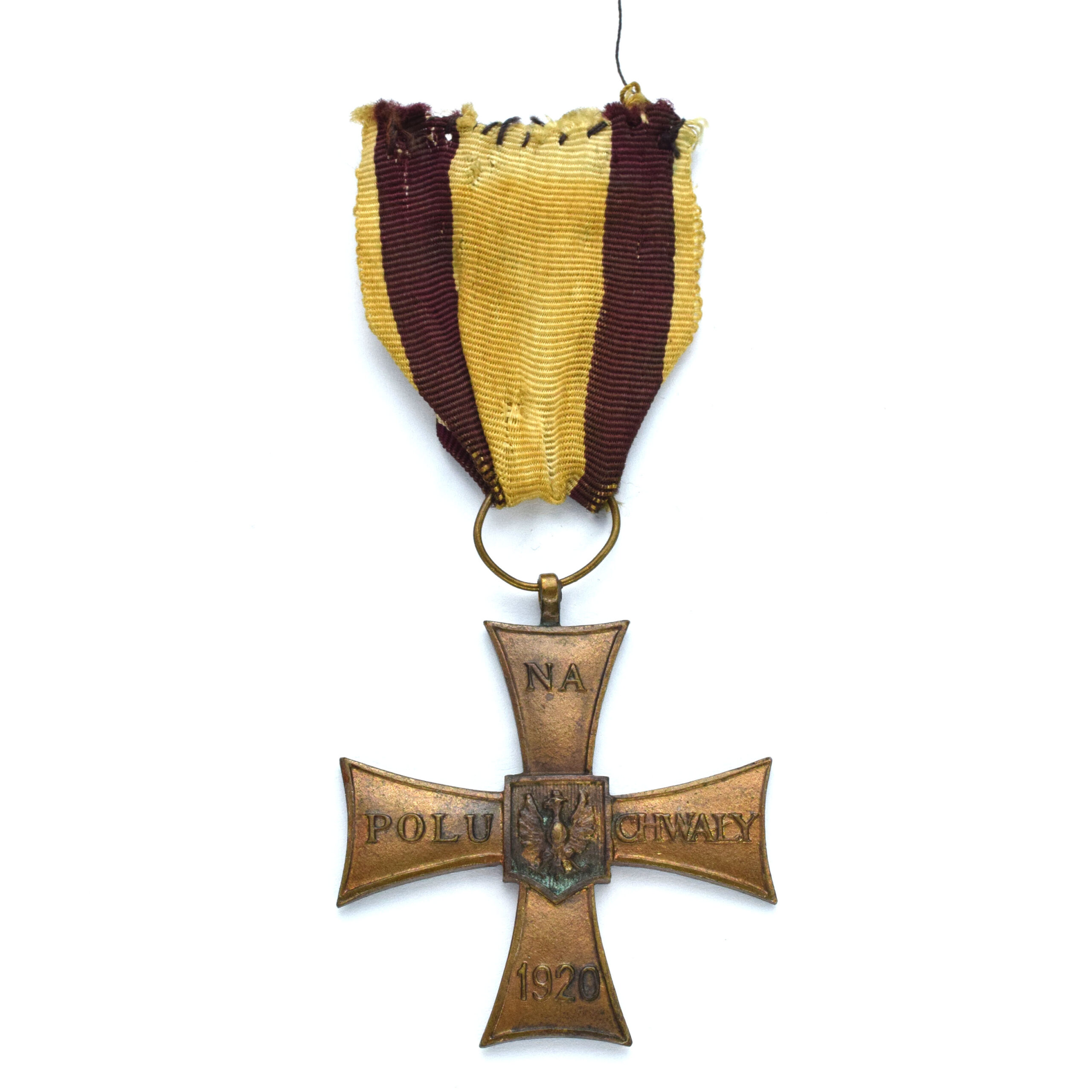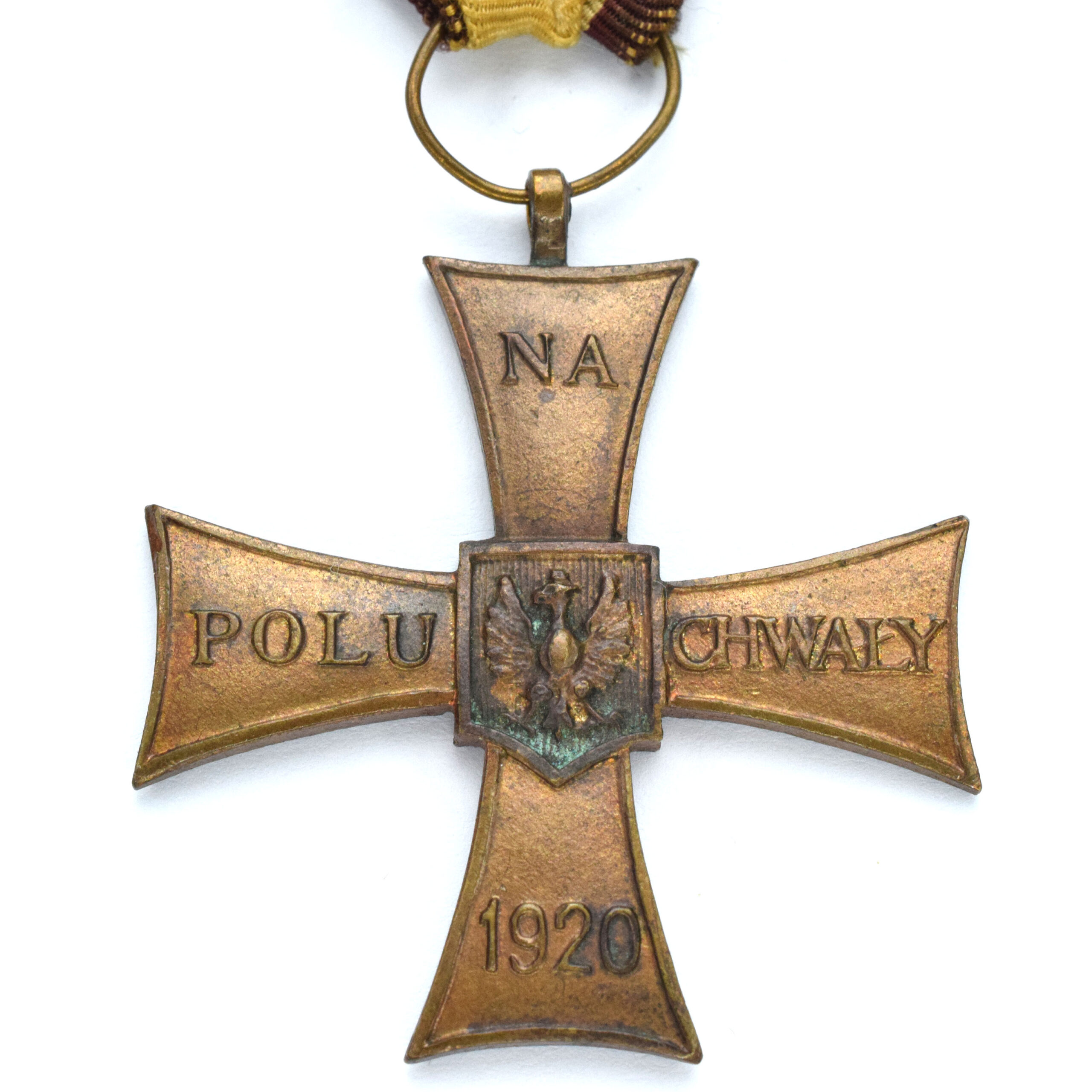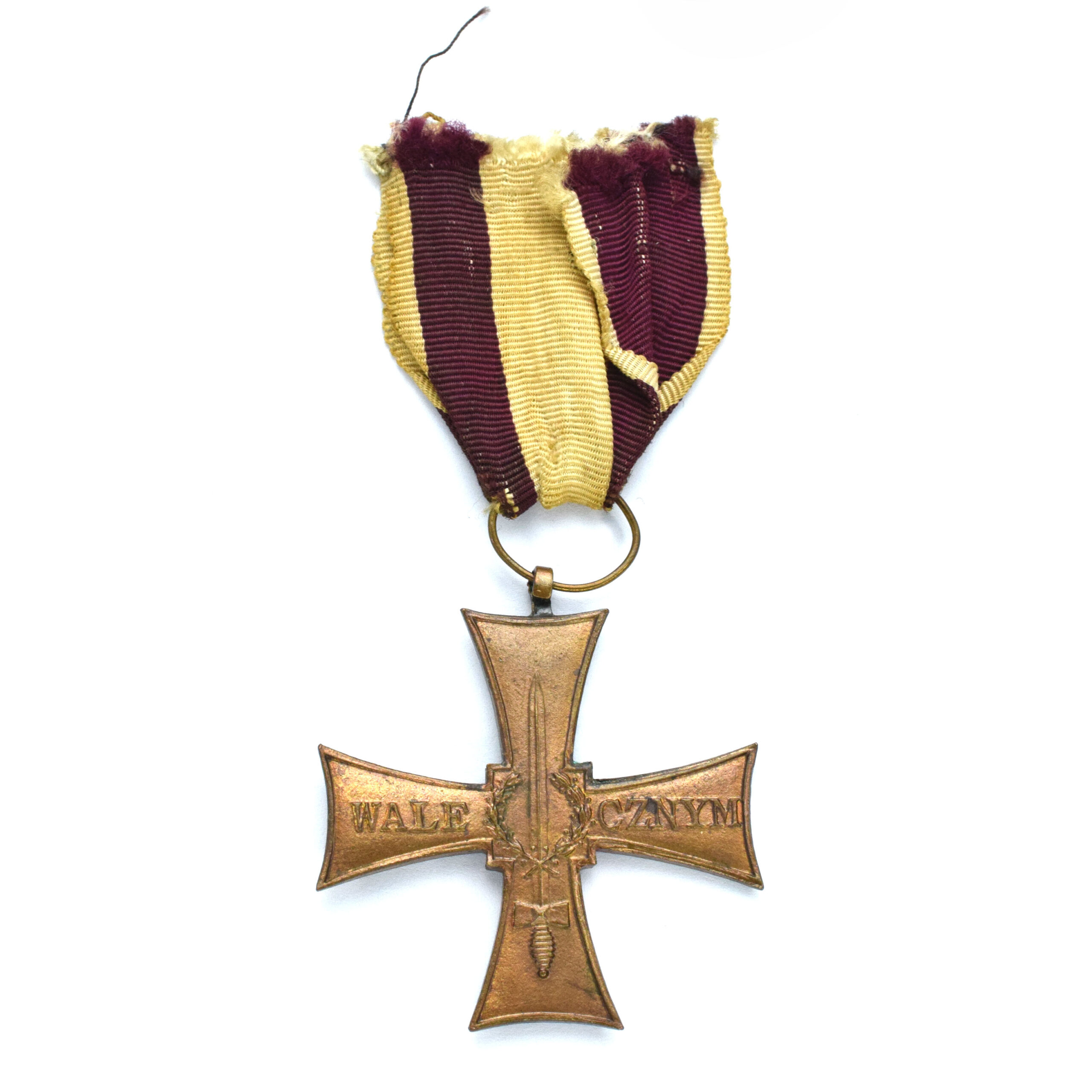 Krzyż ze śladami zielonkawej patyny, wstążka stara oryginalna, ręcznie zszywana. Wymiary 42,7 x 46,5 mm.