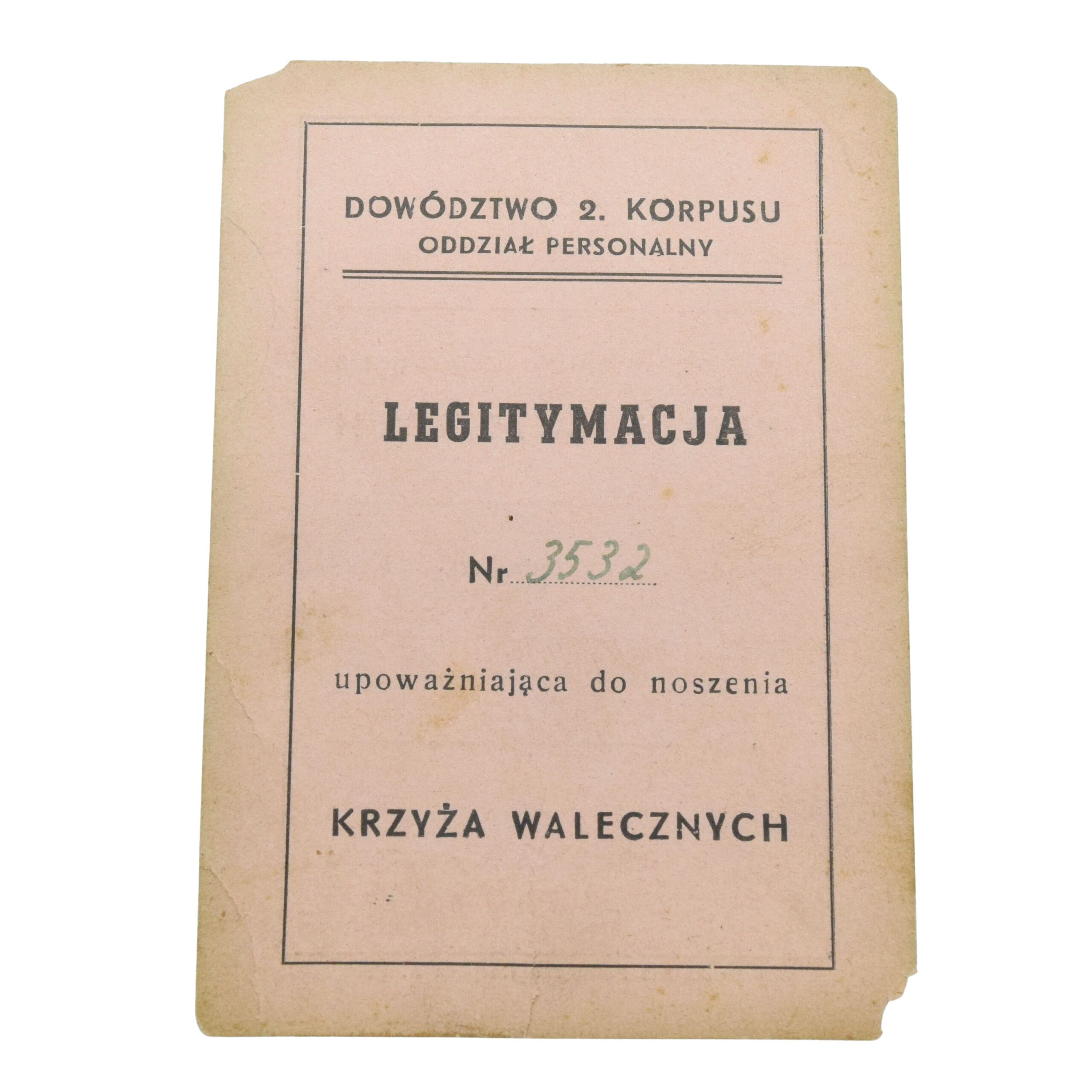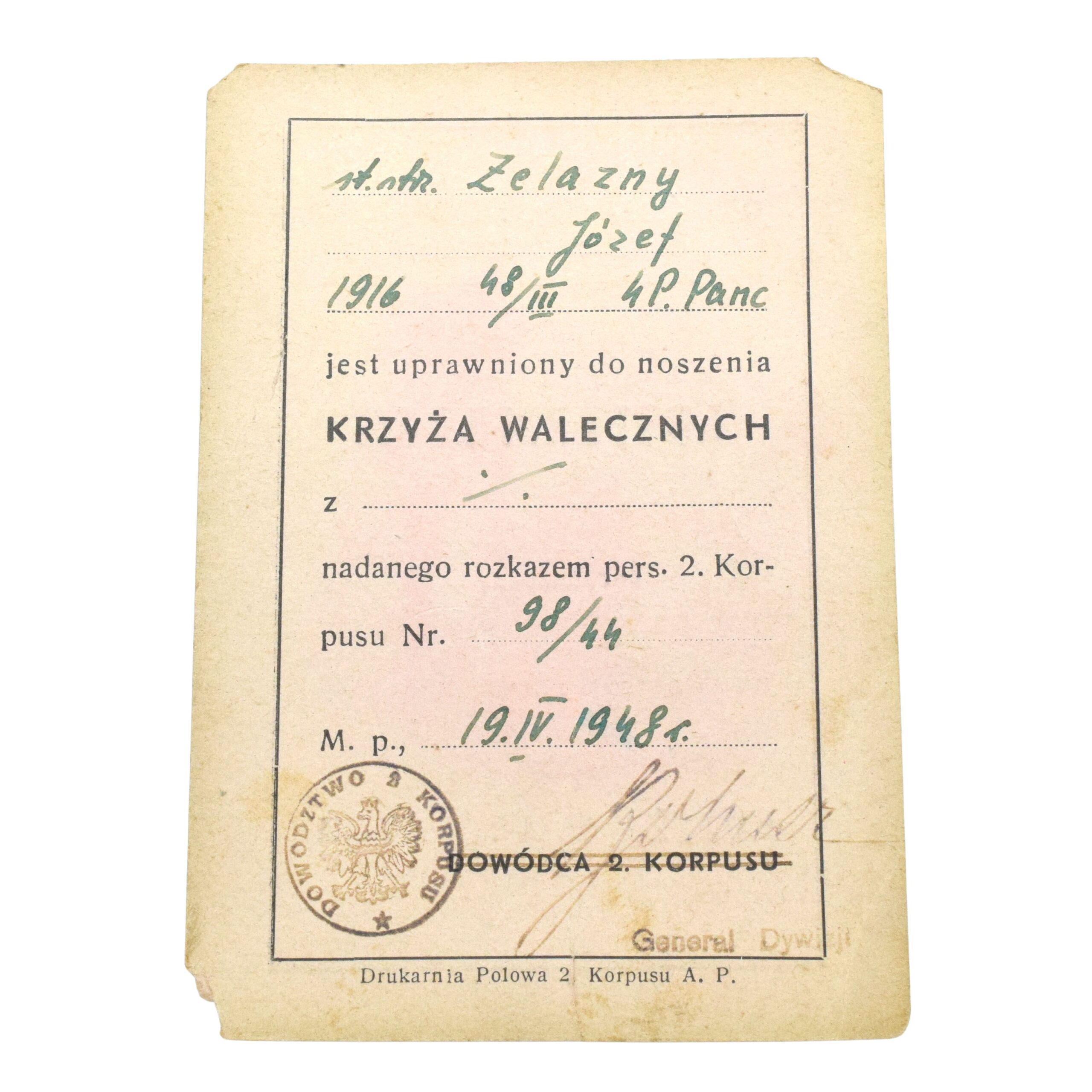 Krzyż Walecznych (katalog Krogulca 24a) wraz z nadaniem odznaczenia starszemu strzelcowi Józefowi Żelaznemu z 4 Pułku Pancernego z 2 Korpusu Polskiego.
