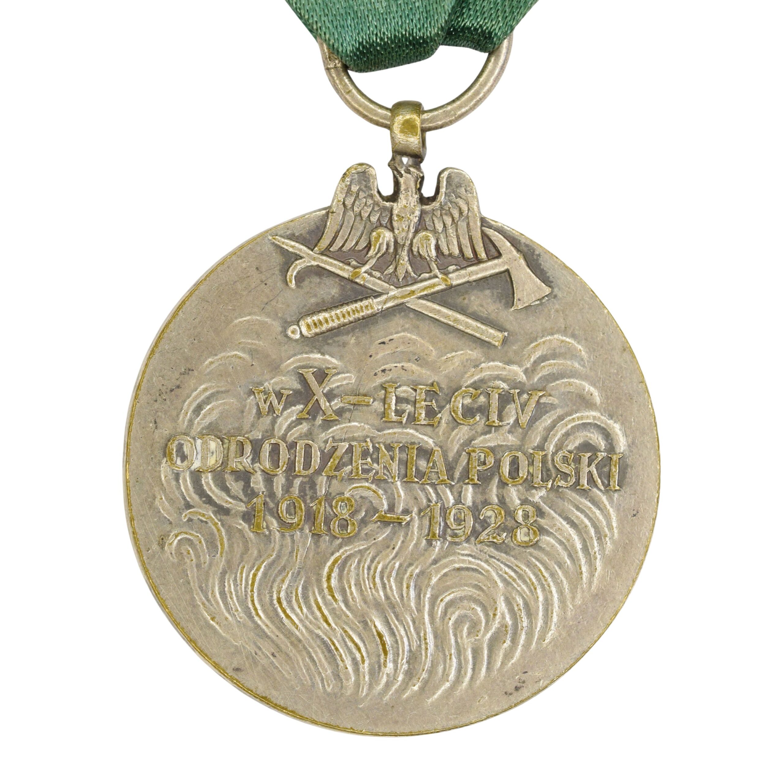Srebrny medal Strażacki X-lecia Odrodzenia Polski ustanowiony w 1928 roku. Prawo do noszenia tego medalu nabywali strażacy po przesłużeniu 5 lat.