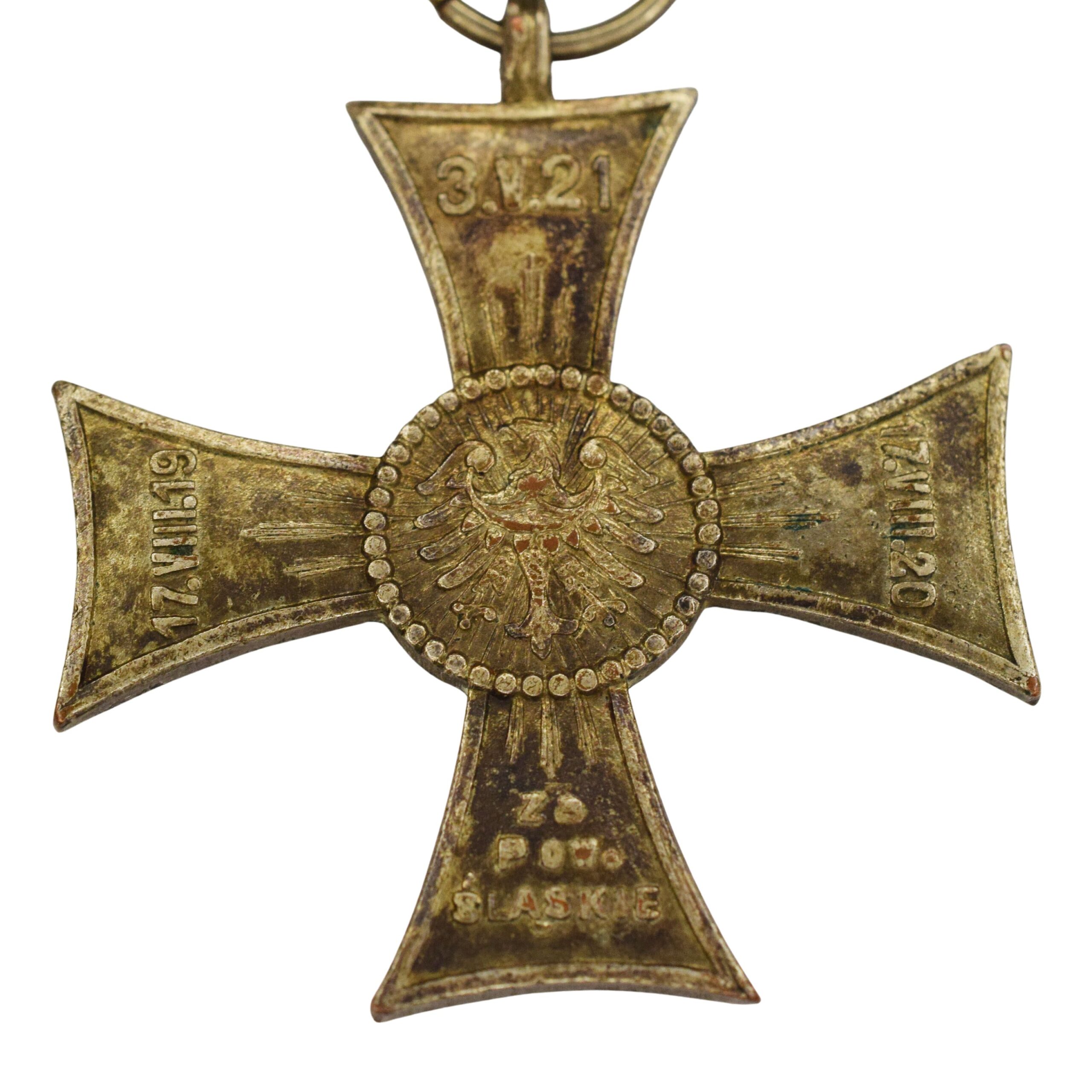 Jedna z kilku międzywojennych odmian wykonania krzyża, ze skrótem „Za Pow. Śląskie”.
