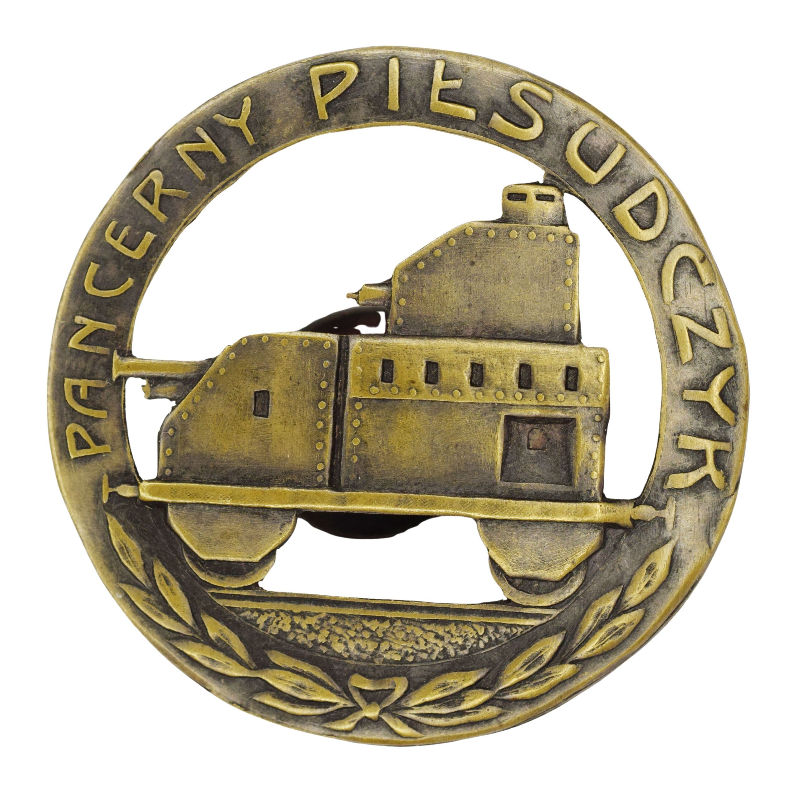 Odznaka Pociągu Pancernego „Piłsudczyk” wykonana w mosiądzu srebrzonym. Słupek mosiężny, nakrętka częściowo zatarta z widocznym napisem „… w Warszawie”