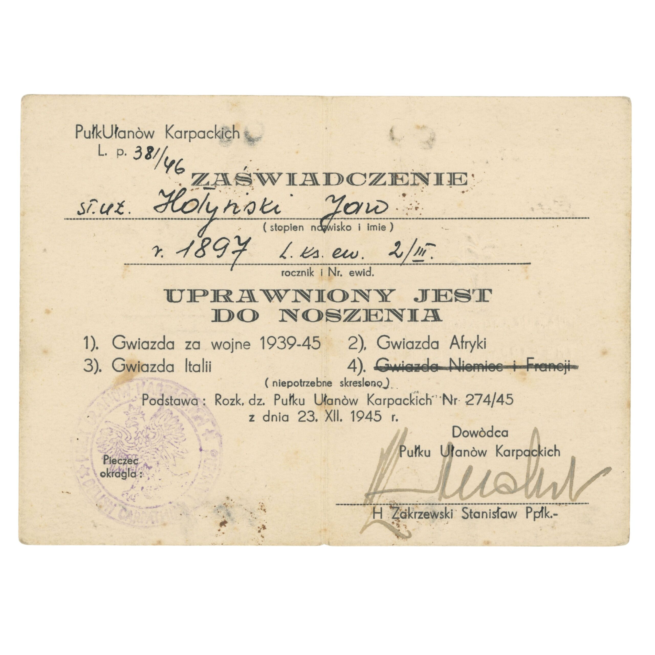 Legitymacja uprawniająca do noszenia Gwiazd Brytyjskich wystawiona na Starszego Ułana Jana Hołyńskiego z Pułku Ułanów Karpackich.