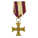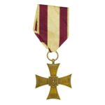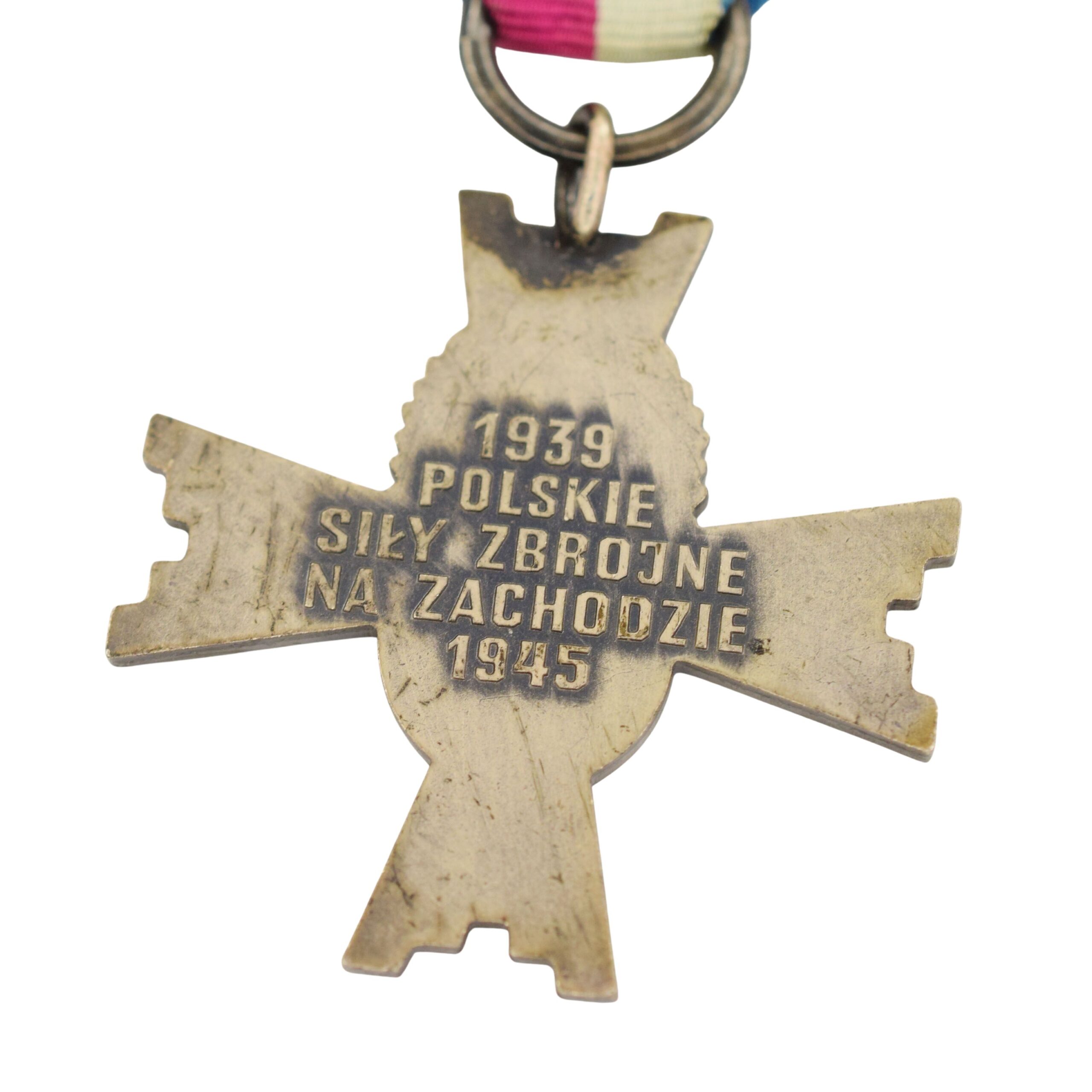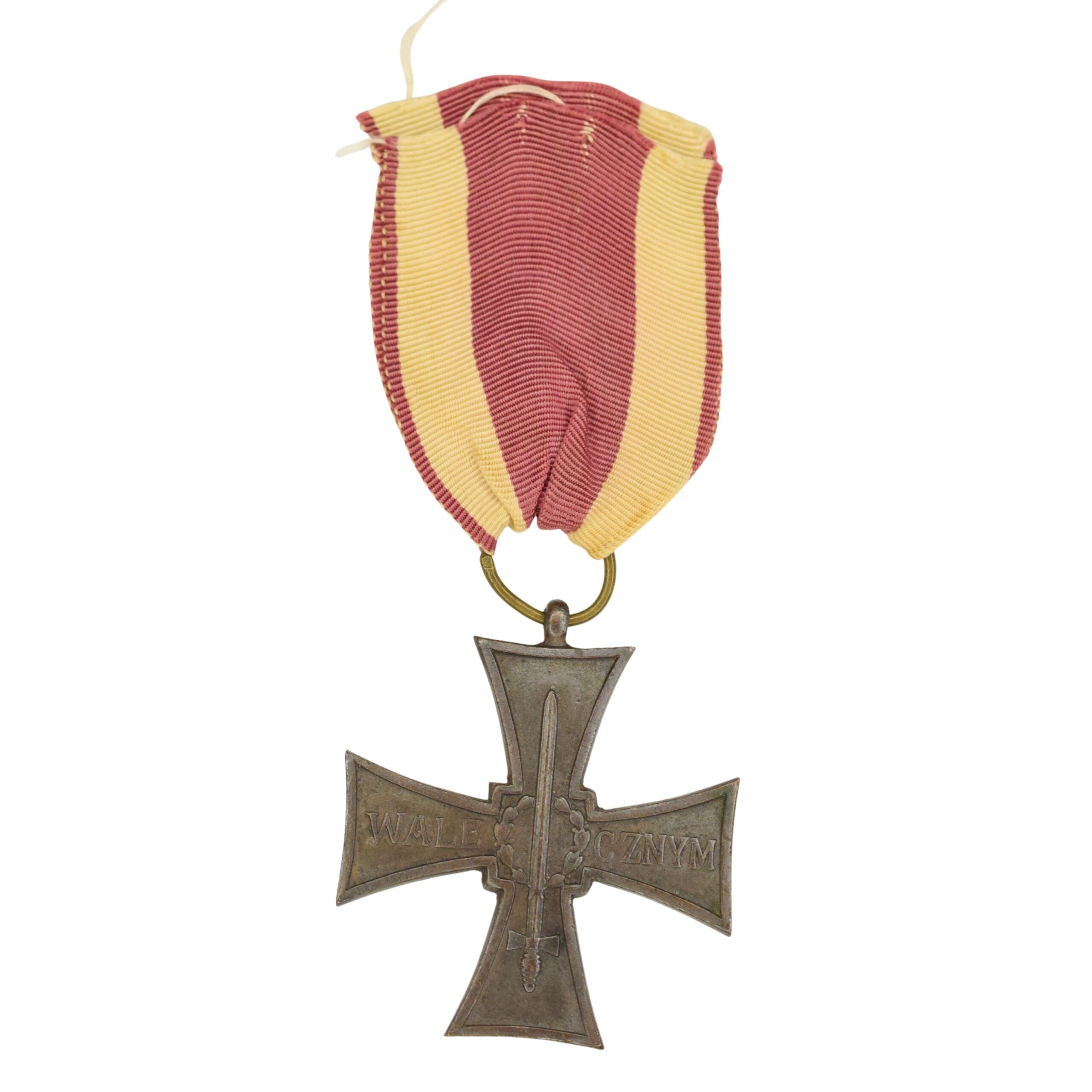 -„Ludowy” Krzyż Walecznych wyprodukowany w Moskiewskich Zakładach Mechanicznych ze starą oryginalną wstążką.