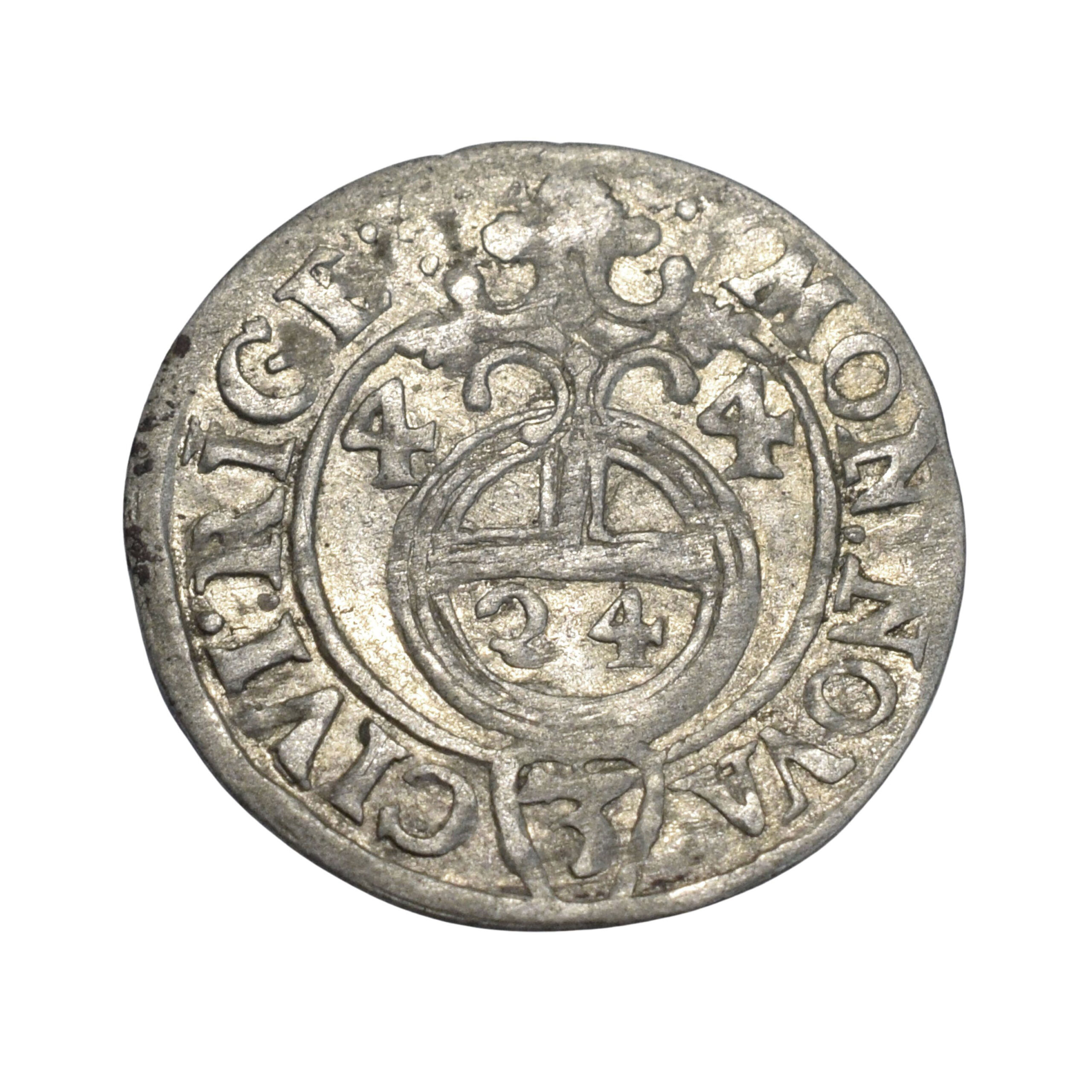 Rw.: Jabłko królewskie dzielące skróconą datę 4-4, w otoku napis: MON NOVA (3) CIVI RIGE