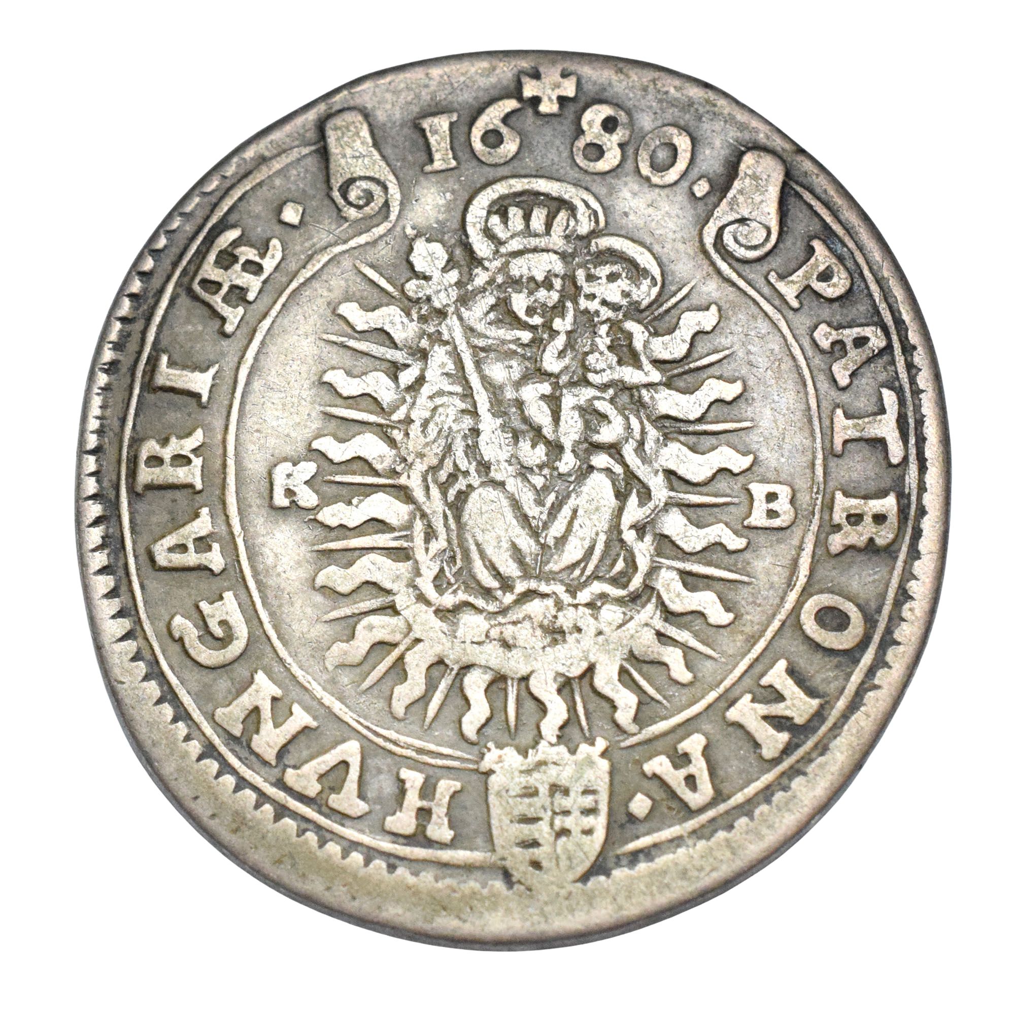 Rw.: Matka Boska z dzieciątkiem nad herbem Węgier, po bokach znak mennicy K – B, w otoku: PATRONA HVNGARIAE 1680
