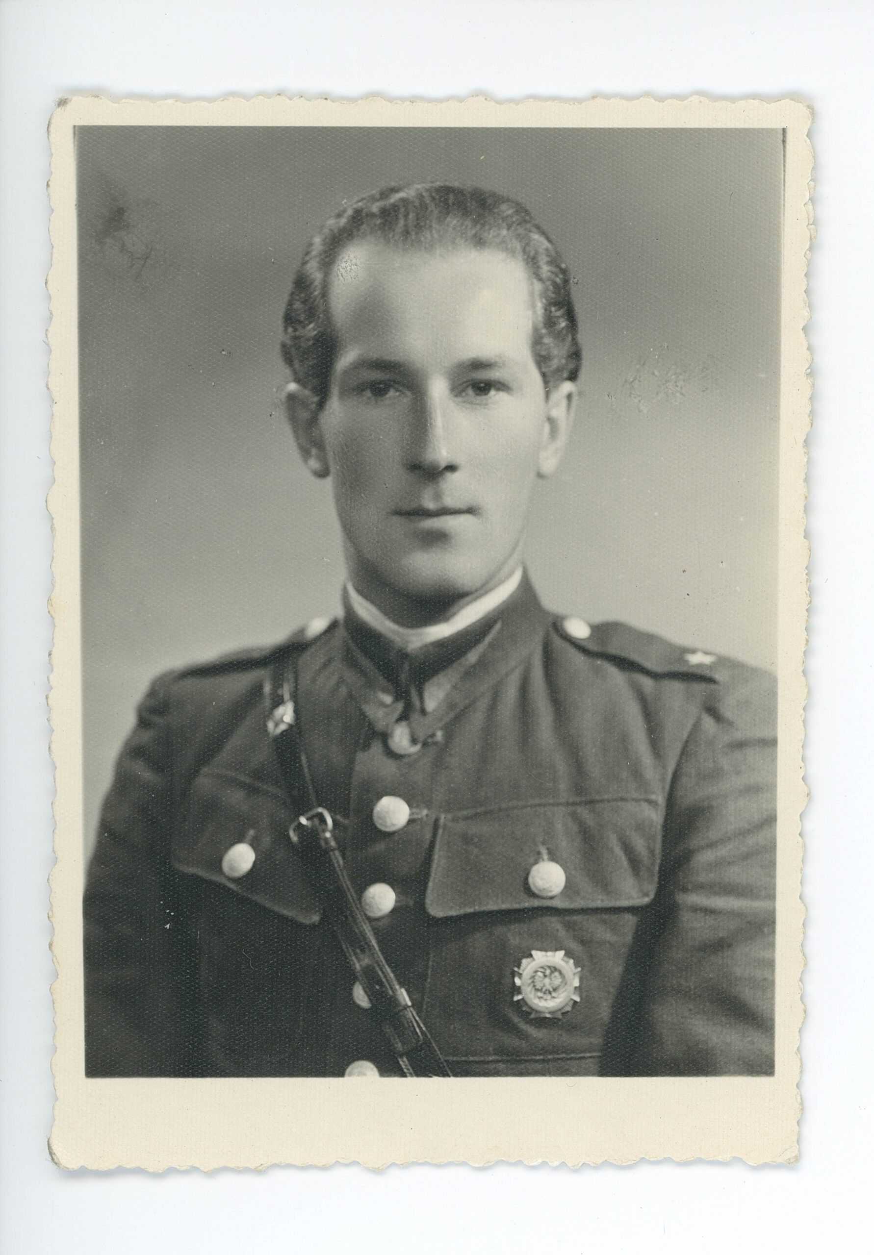 Na mundurze widoczne są przedwojenne odznaki Szkoły Podchorążych Rezerwy Piechoty oraz Związek Oficerów Rezerwy.