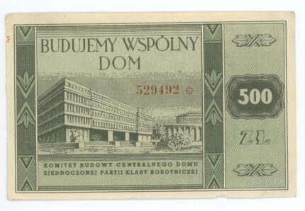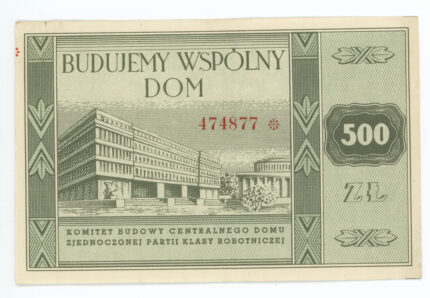 Cegiełka na budowę Domu Partii w Warszawie o nominale 500 złotych.