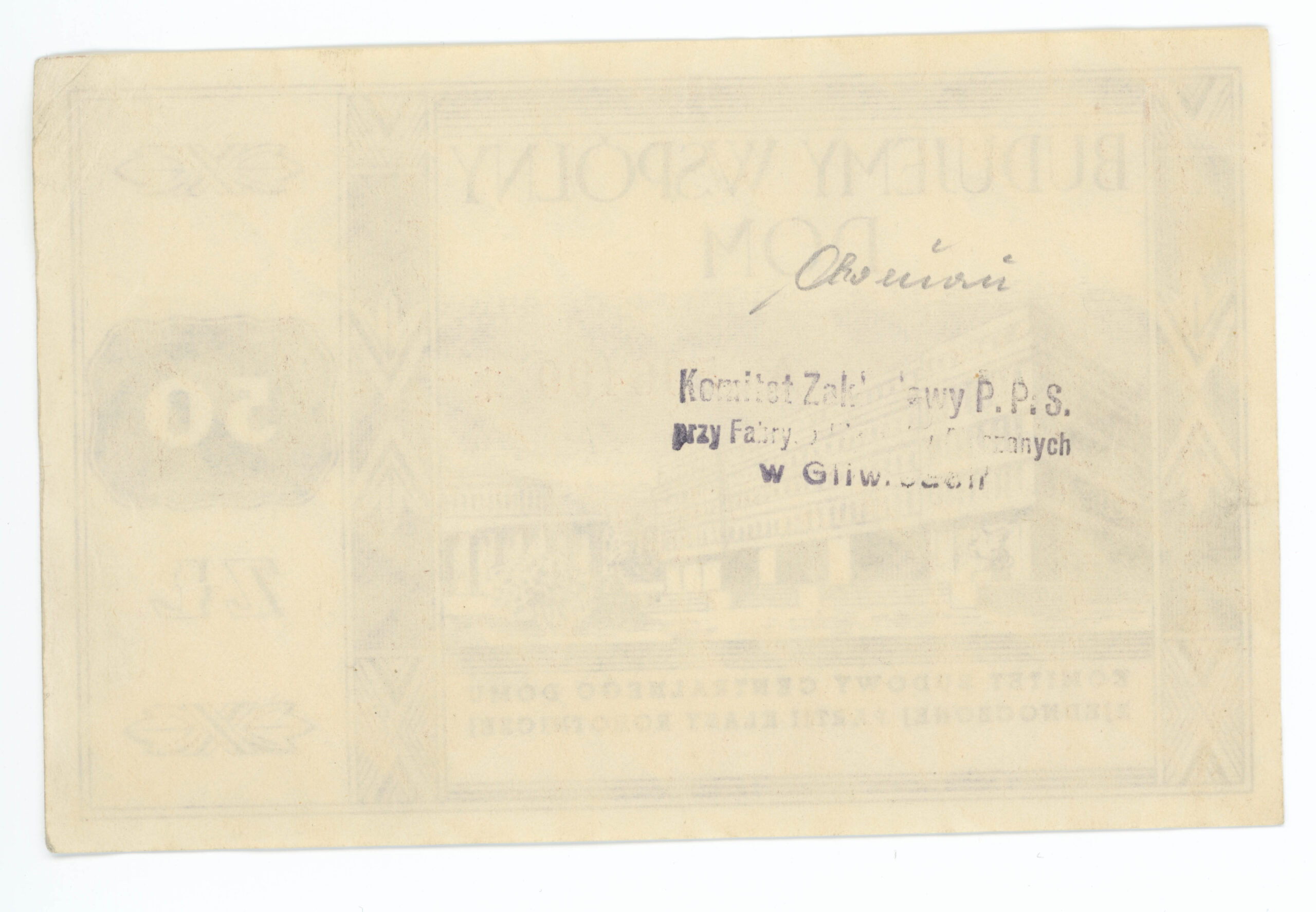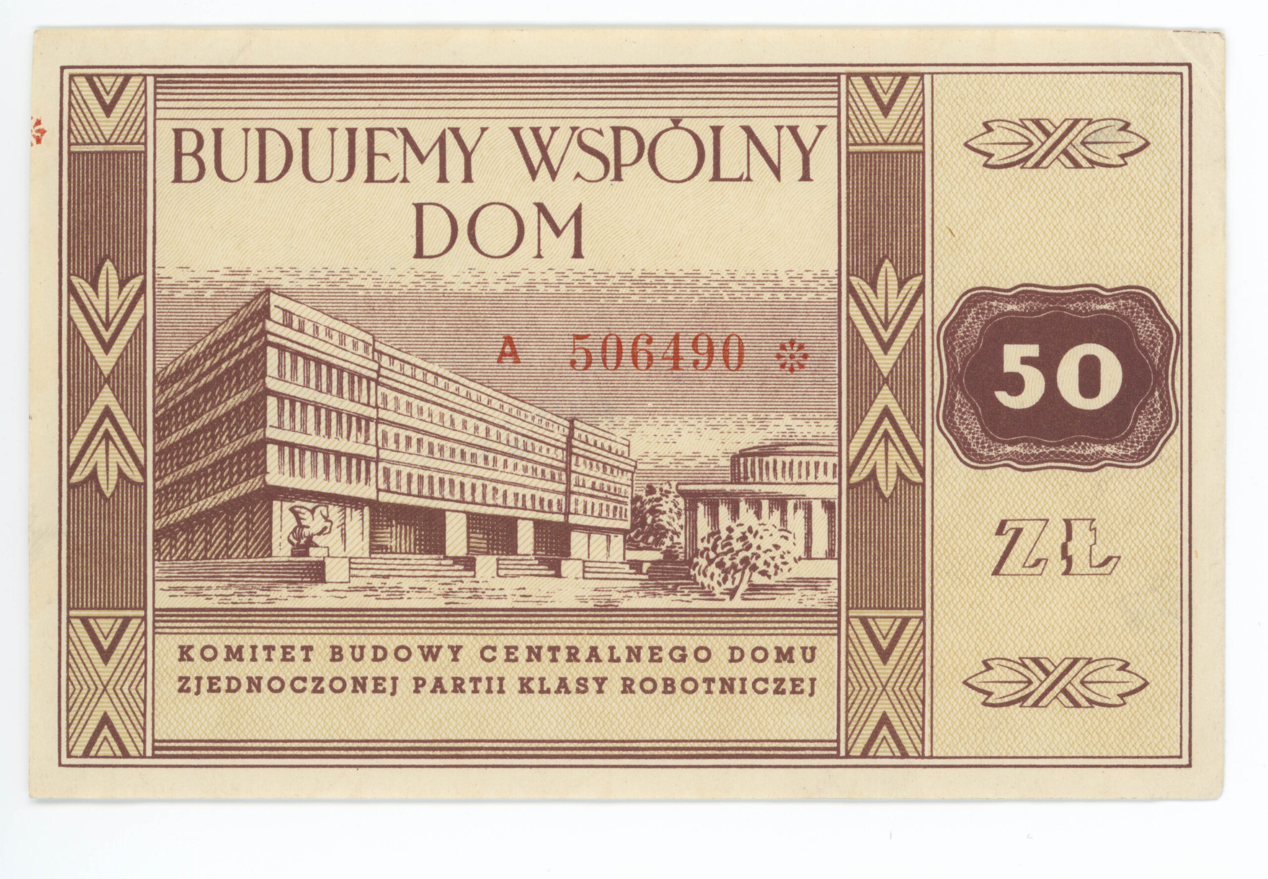 Cegiełka na budowę Domu Partii w Warszawie o nominale 50 złotych.