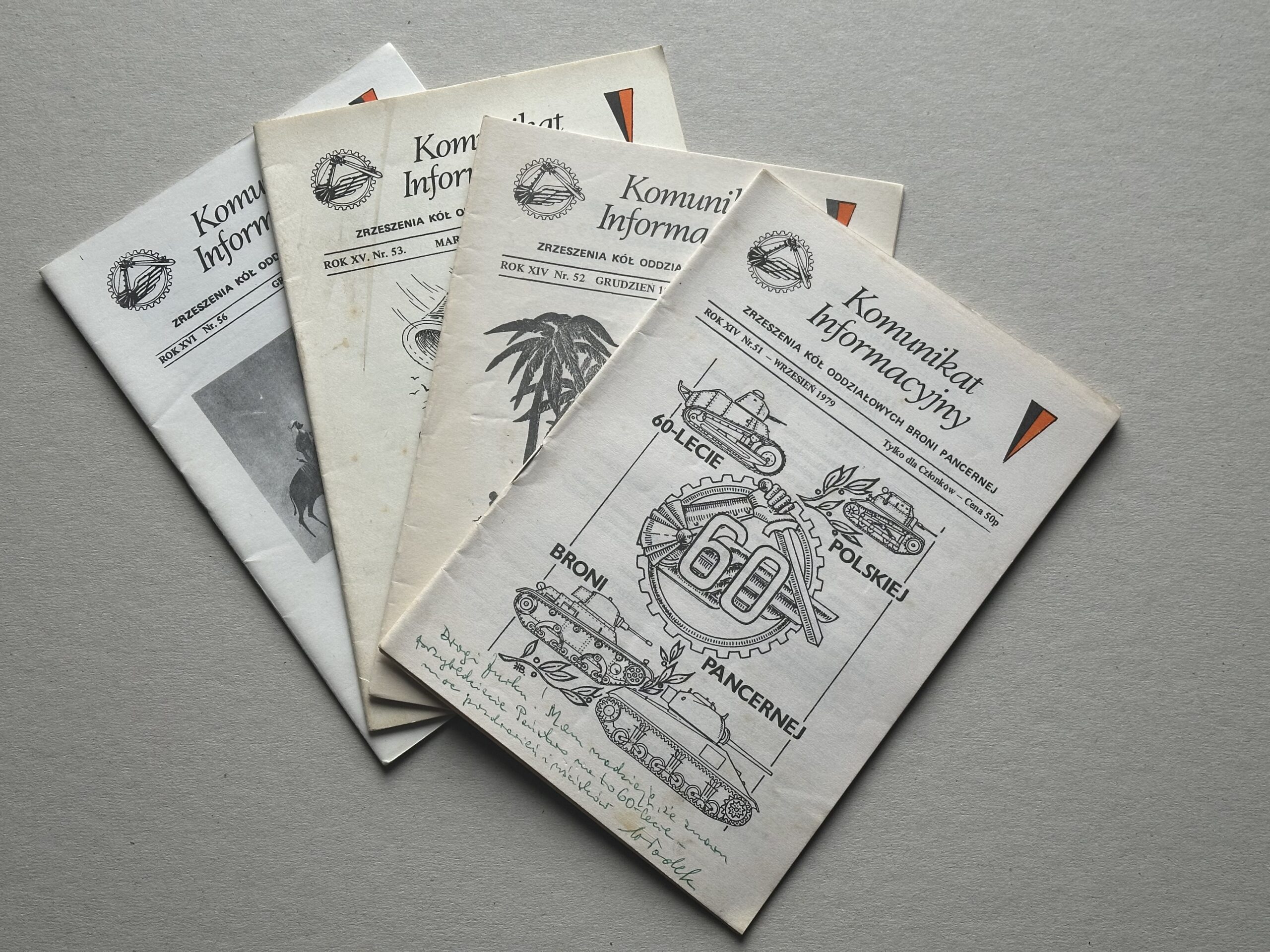 Komunikat Informacyjny Zrzeszenia Kół Oddziałowych Broni Pancernej. Cztery numery z lat 1979-1980-1981. Wydawca: Zrzeszenia Kół Oddziałowych Broni Pancernej, Redakcja: ppłk W. Samira. Każdy numer po 20 stron. Stan bardzo dobry, zawierz zdjęcia, widoczne notatki poprzedniego właściciela.