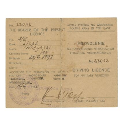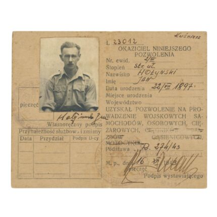 Legitymacja uprawniająca do noszenia Gwiazd Brytyjskich wystawiona na Starszego Ułana Jana Hołyńskiego z Pułku Ułanów Karpackich. Legitymacja ta uprawniała do